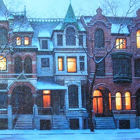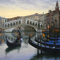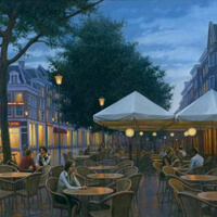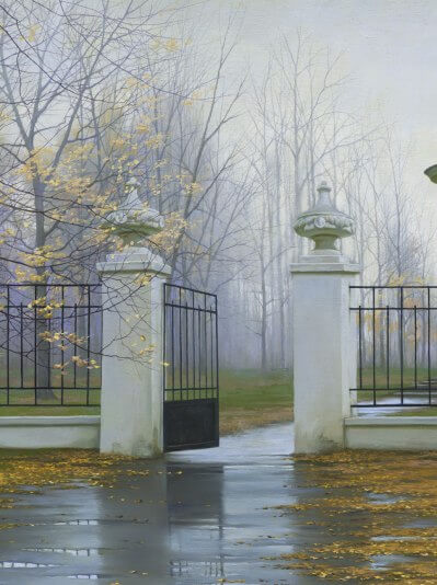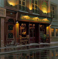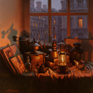 Most recently, Alexei has concentrated his efforts primarily on representing urban life around him in truthful and unglorified terms. A sense of tranquility is conveyed in each of his paintings. They are typically without action of conviviality and most are uncannily still, with only light, space, shadows and color offering dialog. The power and intensity of the relationship between light and dark are the profound forces of his work. The sophisticated application of light effects with color reinforce the majesty of his compositions. Butirskiy's paintings are reminiscent of the works of Claude de Lorraine and Caravaggio with their luminescent qualities and skillful variations of light and dark.