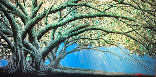 Oryan’s paintings include the traditional and the unexpected:  acrylic paint, crushed crystals, ground quartz, and translucent micas.  Oryan uses paintbrushes, blow-torches, gravity and his bare hands to coax the colors and substances multi-directionally each singular layer at a time. Every completed painting is the result of 20-30 layers of artistic application and complexity.  Due to the volatility of the components, Oryan must prepare and complete each individual layer in an uninterrupted flow of artistic focus...